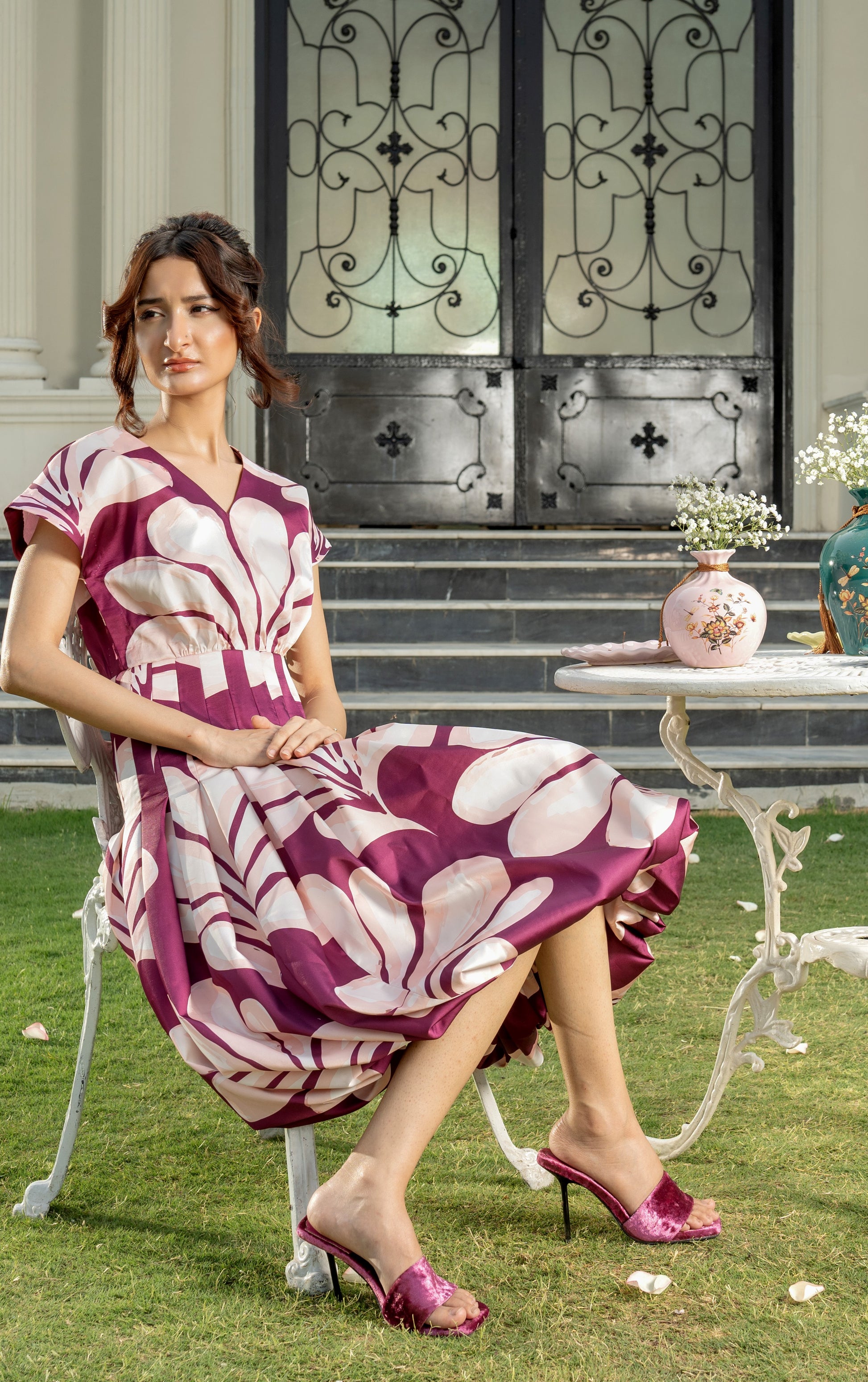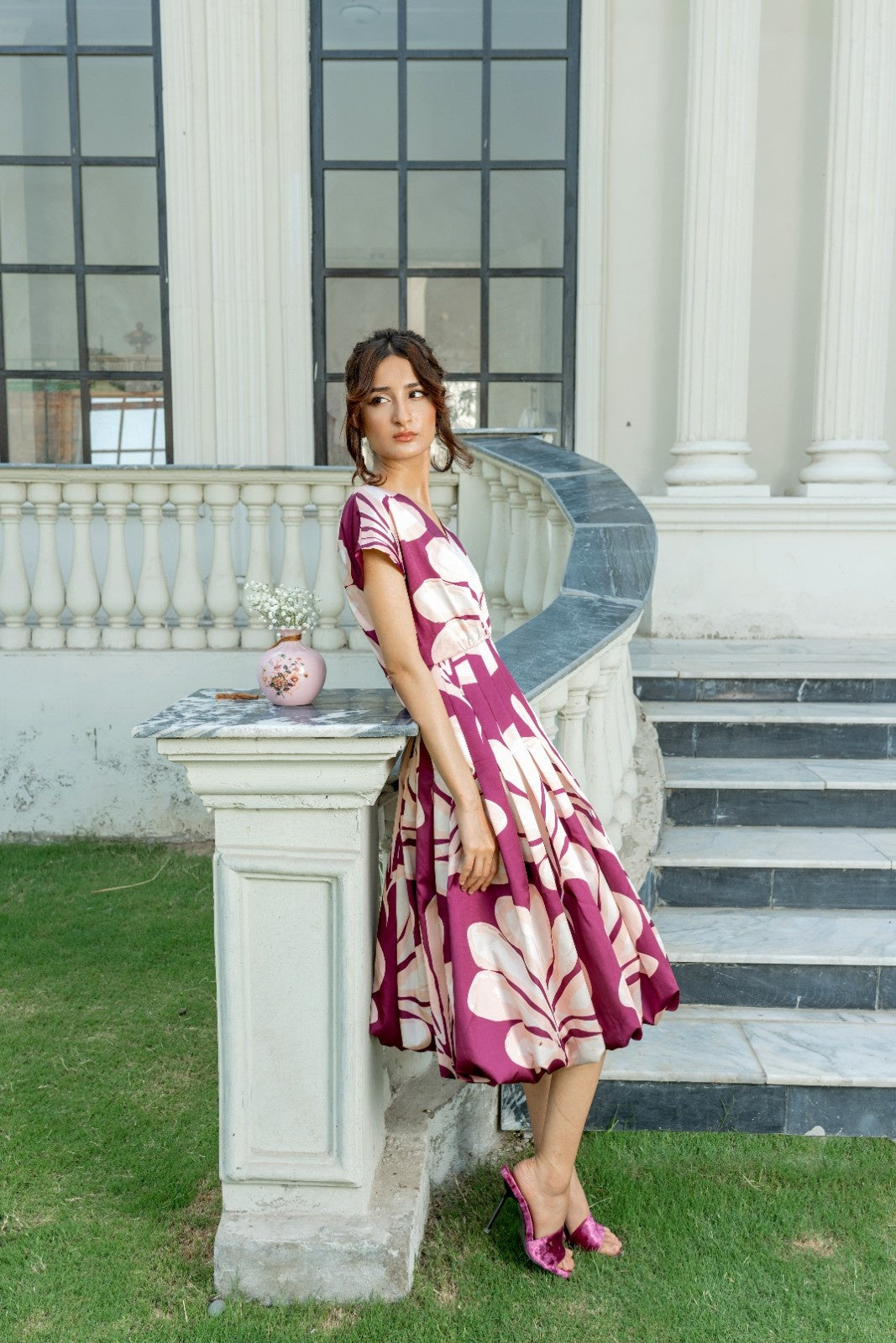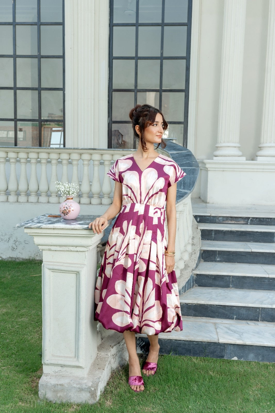 Effortless charm meets contemporary elegance in the Delicate Plum dress. Designed with a playful yet sophisticated balloon hem and rich plum and blush abstract print, this midi dress is a perfect pick for women who love to stand out in subtle style.
